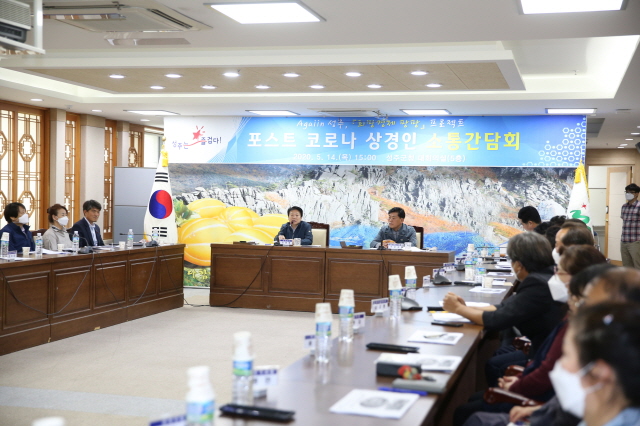 【경상포커스=전상철기자】성주군은 14일 오후 3시 군청 대회의실에서 코로나19 발생에 따른 피해를 최소화하고 지역경제의 조속한 정상화를 위한 소상공인 지원시책 설명 등 경제현안에 대해 지역 상경인과 소통간담회를 가졌다.