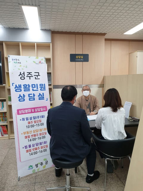 성주군 생활민원 상담실은 법무사, 공인중개사, 일자리 전담 컨설턴트를 전문상담관으로 지정해 운영되며 전문적인 상담 서비스를 제공함으로써 관련 사무실을 찾아야 했던 번거로움과 비용부담을 해소해 줄 것으로 기대된다.