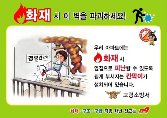 고령소방서, 아파트 비상 탈출구 경량칸막이 홍보![]() 【경상포커스=전상철기자】고령소방서(서장 김태준)는 공동주택 화재 시 안전한 장소로 대피해 인명피해를 줄일 수 있는 공동주택 경량칸막이 활용법을 홍보한다고 밝혔다.