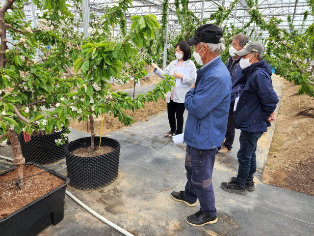 이후 농업기술원의 체리 연구시설하우스를 견학하며 미래형 체리 화분재배 및 적정 적심 시기에 대해 배웠다.