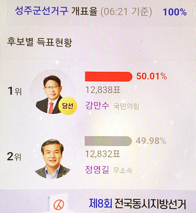 2일 중앙선거관리위원회에 따르면 성주군 경북도의원 선거 개표를 마감한 결과 국민의힘 강만수 후보가 1만2천838표를 얻어 1만2천832표를 얻은 무소속 정영길 후보를 가까스로 누르고 승리했다.
