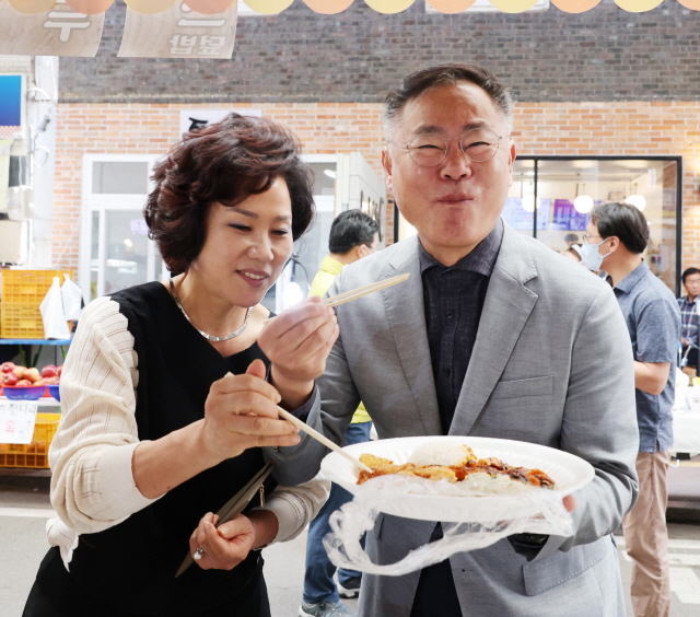 이날 김 군수는 왜관시장 상인이 준비한 모든 부스를 방문해 다양한 음식을 직접 맛보며 기념 촬영을 이어갔다.