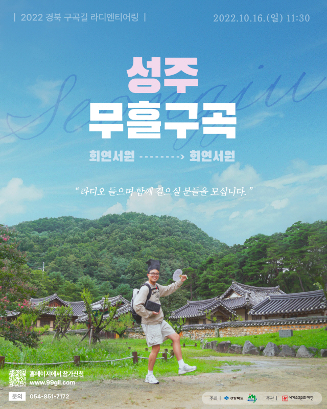 성주 무흘구곡 라디엔티어링은 라디오를 들으며 회연서원을 출발해 대가천을 따라 한강 정구선생의 학문이 살아있는 무흘구곡길을 걷는 행사로, 역사문화트레킹 영남선비의 자취와 계곡의 아름다움을 몸소 체험해 볼 수 있다.