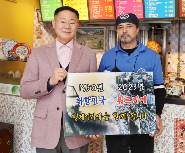 김재욱 칠곡군수는 케밥 가게를 찾아 가족의 안부를 물으며 응원 문구가 담긴 그림판을 들며 따뜻한 위로의 손길을 내밀었다.