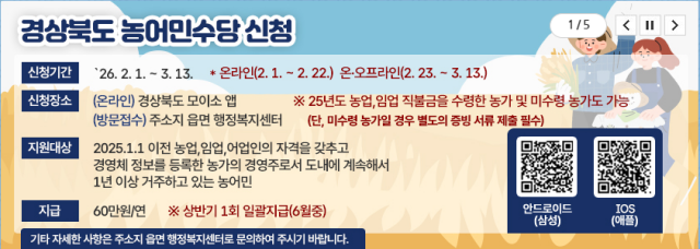성주군, 2026년 농어민수당 신청접수 시작![]() 모바일 선접수 (2.1~2.22.), 주소지 읍면사무소 방문·모바일 동시 접수(2.23~3.13.)