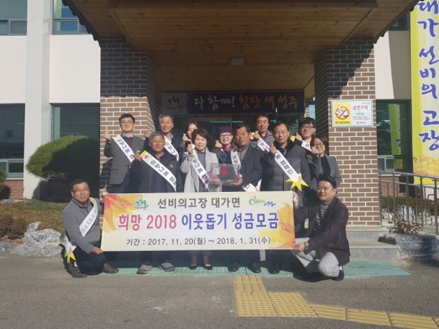 임옥자 대가면장은 “최근 지진 등 사회, 경제적으로 어려움이 큰 한해 인 것 같다.”며, “이번 나눔 캠페인을 통해 우리지역의 연말연시 소외된 이웃에 따뜻한 마음이 전해지도록 노력 하겠으며, 지역민과 출향인의 많은 참여”를 당부했다.